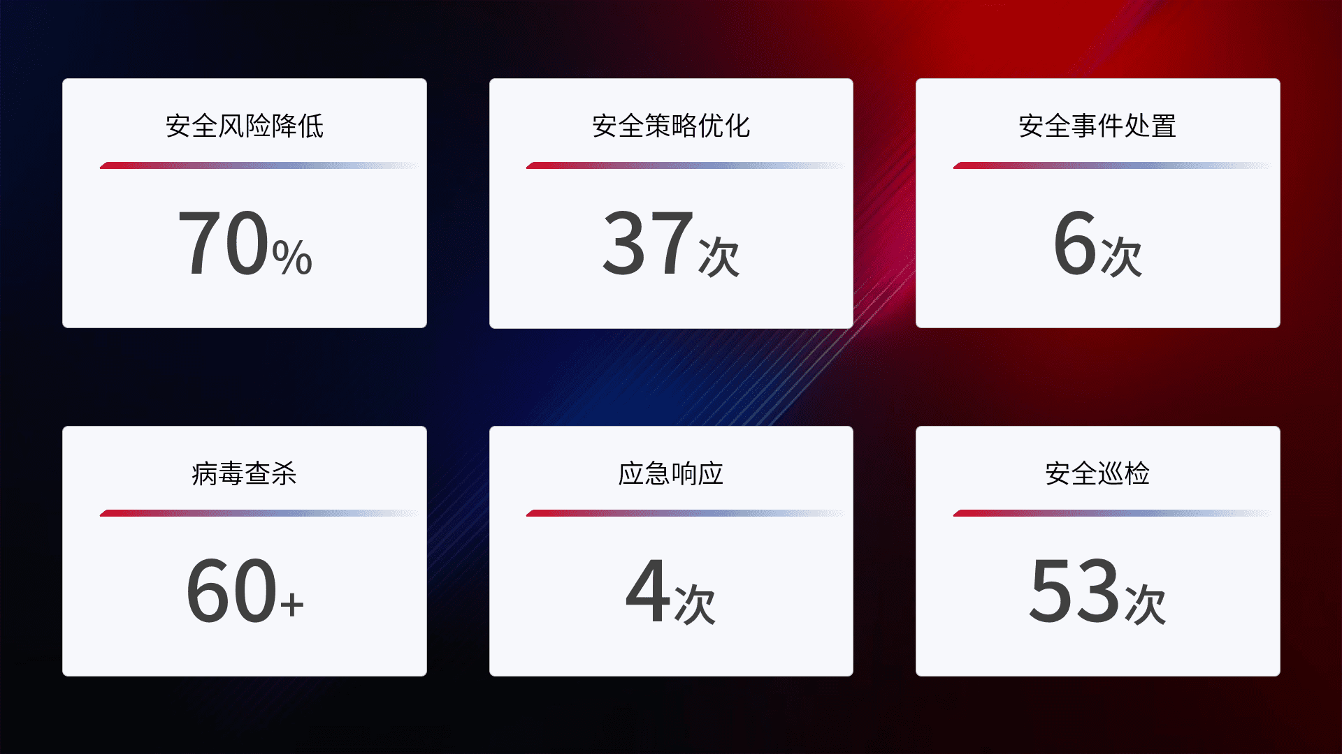 提供全面的安全事件报告体系,,,包括处置报告、、、周报、、、季度和年度总结,,,,结合持续监控,,帮助客户深入了解网络安全状况。。