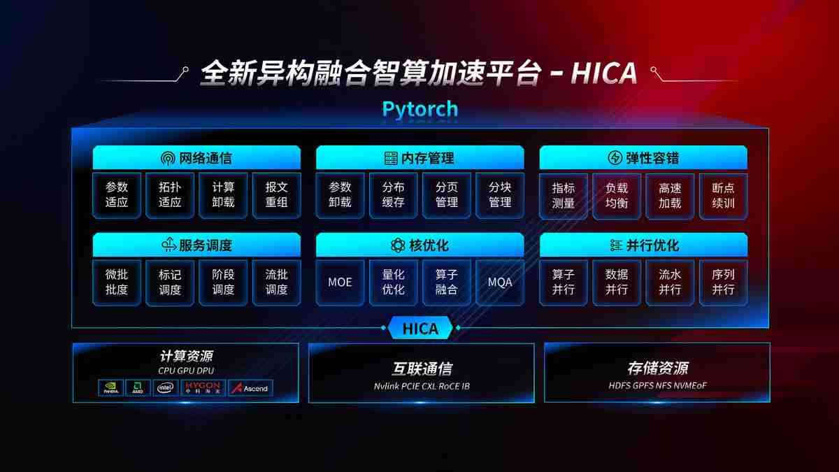 通过自研的服务层、、中间适配层、、、、以及调度编排算法,,,采用数据并行、、模型并行等多种并行方式,,把并行计算任务进行有效的分解,,,,使其分别由相应的软件栈和算力资源来承接。。当GPU资源变化,,,,HICA可以实时动态调度计算子任务并调整模型拓扑和架构,,,,以充分聚合各种算力资源。。。